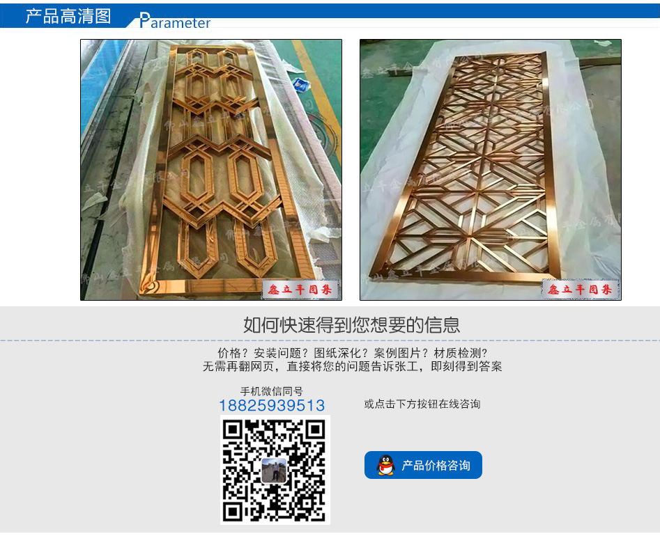 產(chǎn)品尺寸:根據(jù)需求定制 產(chǎn)品材質(zhì):201、304、316L 可選顏色:玫瑰金、鈦金、黑鈦金、香檳金、青古銅、紅古銅、咖啡金、灰色、按樣板定制 適用場所: 酒店、餐廳、會所、售樓部、商場、別墅、KTV