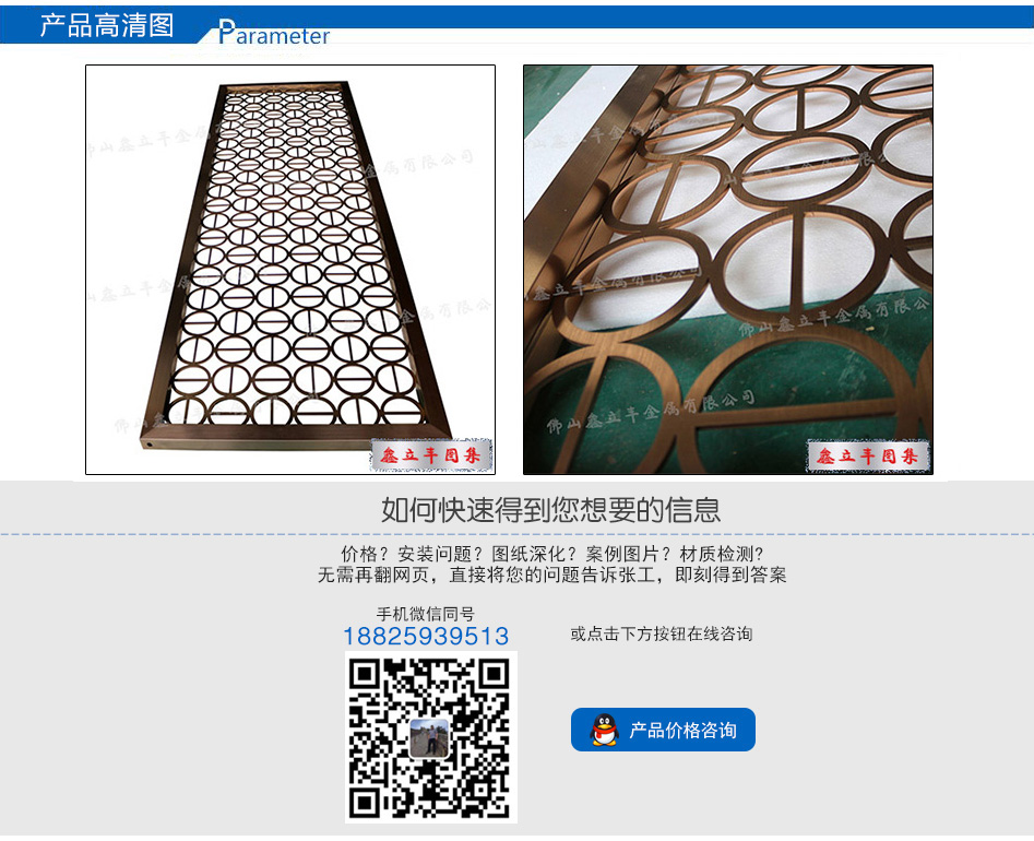 產(chǎn)品尺寸:根據(jù)需求定制 產(chǎn)品材質(zhì):201、304、316L 可選顏色:玫瑰金、鈦金、黑鈦金、香檳金、青古銅、紅古銅、咖啡金、灰色、按樣板定制 適用場所: 酒店、餐廳、會所、售樓部、商場、別墅、KTV