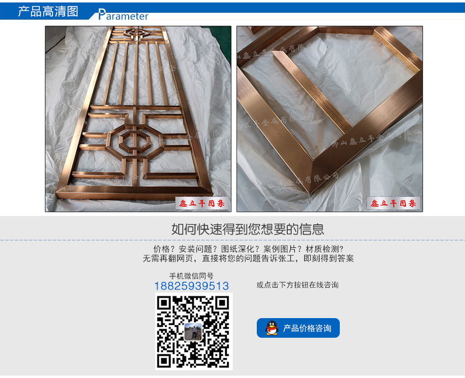 產品尺寸:根據(jù)需求定制 產品材質:201、304、316L 可選顏色:玫瑰金、鈦金、黑鈦金、香檳金、青古銅、紅古銅、咖啡金、灰色、按樣板定制 適用場所: 酒店、餐廳、會所、售樓部、商場、別墅、KTV