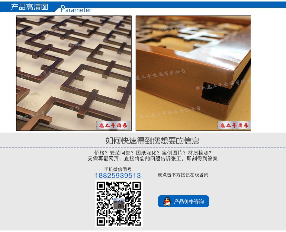 產(chǎn)品尺寸:根據(jù)需求定制 產(chǎn)品材質(zhì):201、304、316L 可選顏色:玫瑰金、鈦金、黑鈦金、香檳金、青古銅、紅古銅、咖啡金、灰色、按樣板定制 適用場所: 酒店、餐廳、會所、售樓部、商場、別墅、KTV